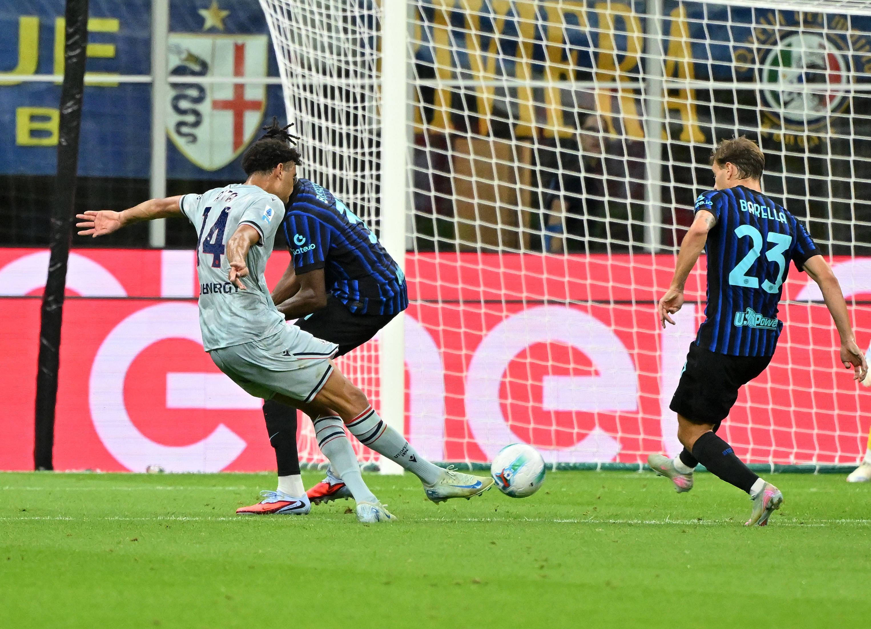 8月31日,国际米兰队球员巴雷拉(右)与乌迪内斯队球员巴约在比赛中拼抢。 新华社发(阿尔贝托·林格利亚摄)